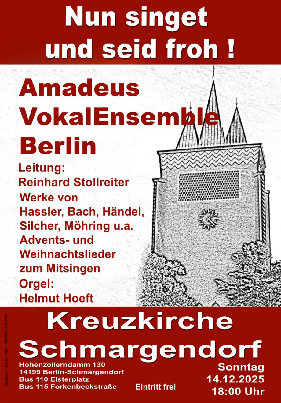 Unser Weihnachtskonzert findet am 14. 12. 2025 um 18 Uhr wieder in der Kreuzkirche Berlin-Schmargendorf statt.